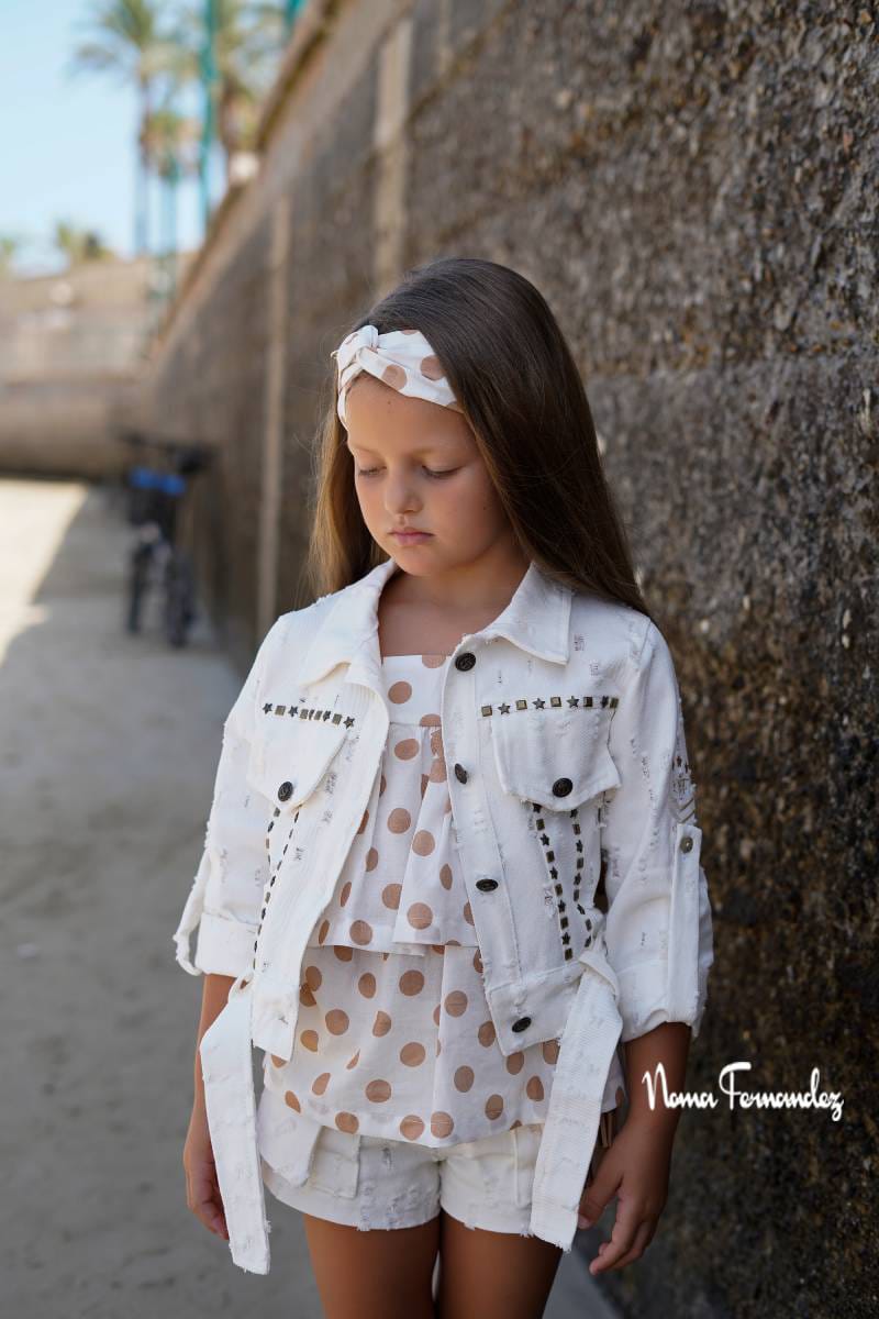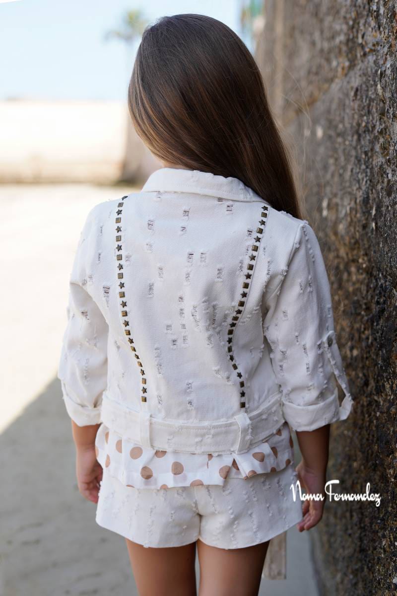 Cazadora abotonada delante con cuello en tejido perforado y detalles de tachas