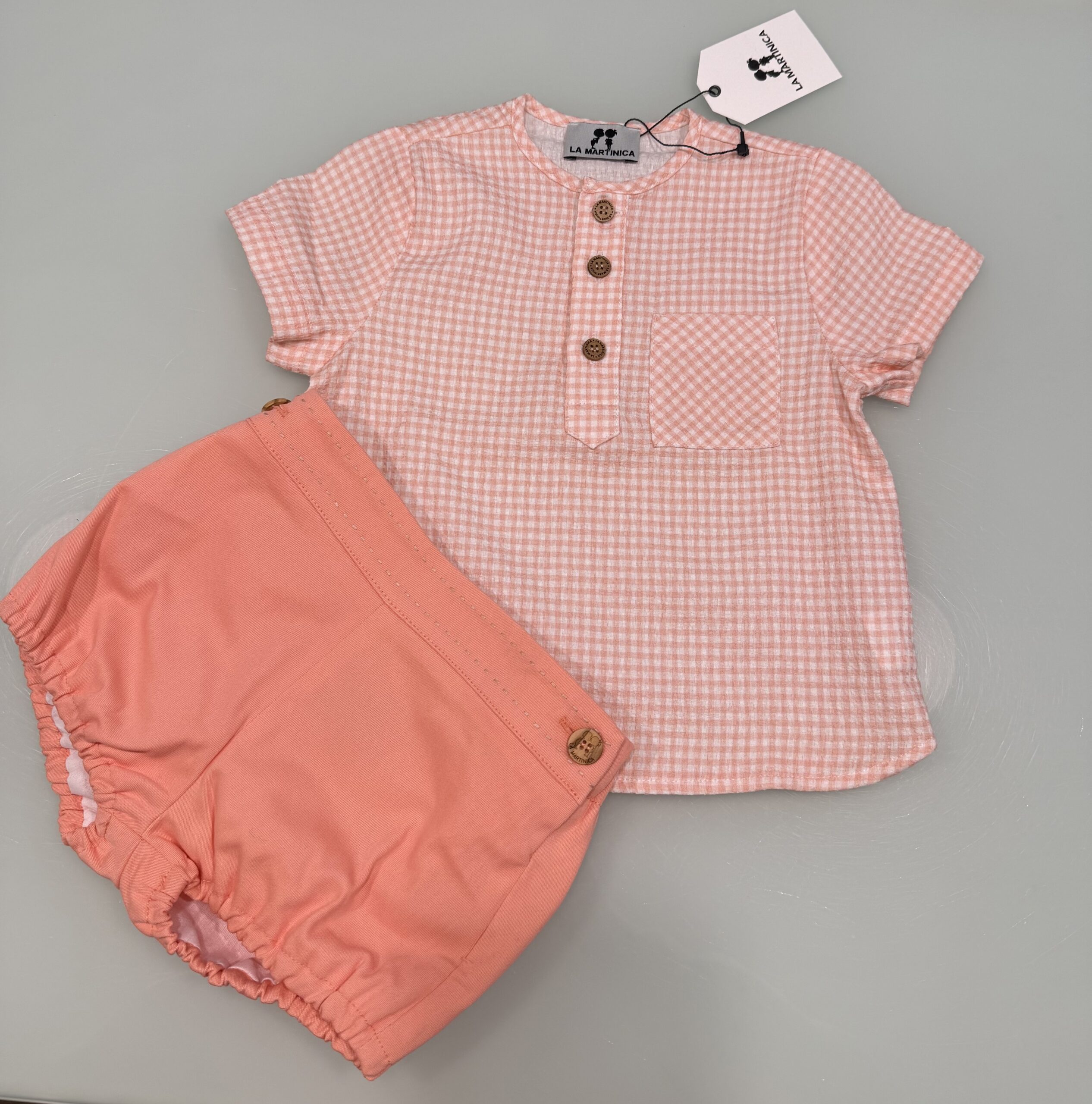 Conjunto de niño compuesto de camisa manga corta en vichy melocotón más bombachito