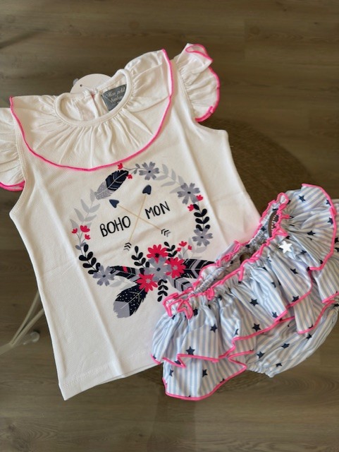 Conjunto de niña compuesto de camiseta algodón blanca sin mangas con dibujo en el pecho , cuello volante y volante en los hombros rematado en fluor rosa , más braguita volante en tejido rayas con estrellas marino todo rematado en fluor rosa