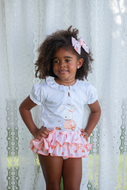 Conjunto de niña compuesto de camiseta algodón blanca de manguita corta con goma fruncidita , cuello volante con puntilla batista y estampación conejito en el pecho