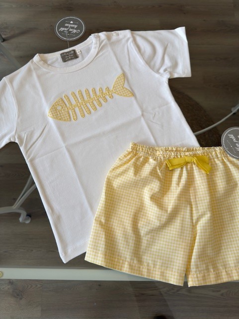 Conjunto de niño compuesto de camiseta algodón blanca con rasca de pez bordado y en tejido vichy amarillo más bermuda cortita con goma en la cintura en tejido vichy amarillo