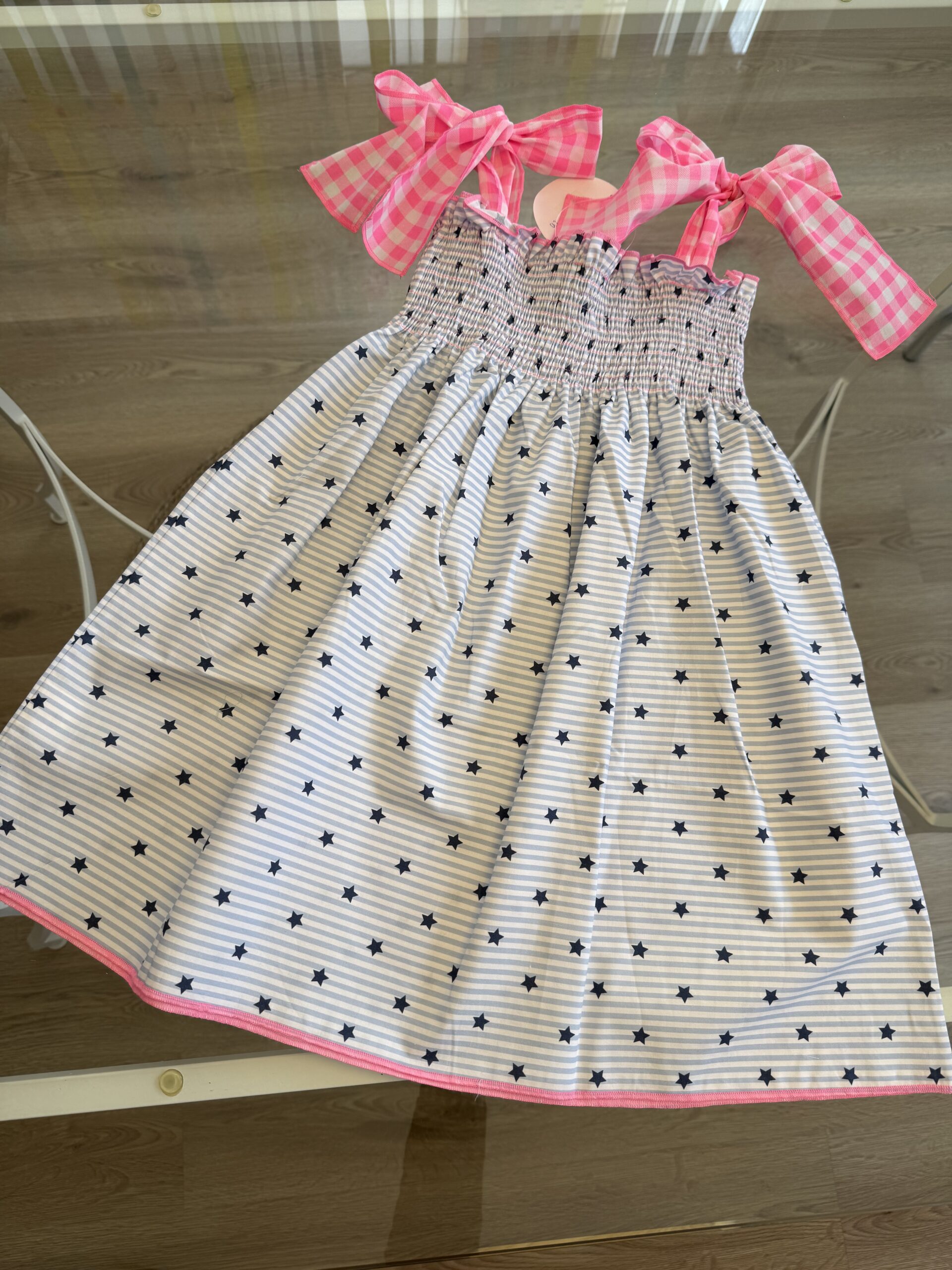 Vestido engomado en tejido rayitas con estrellas combinado con lazadas en los hombros en tejido vichy rosa fluor