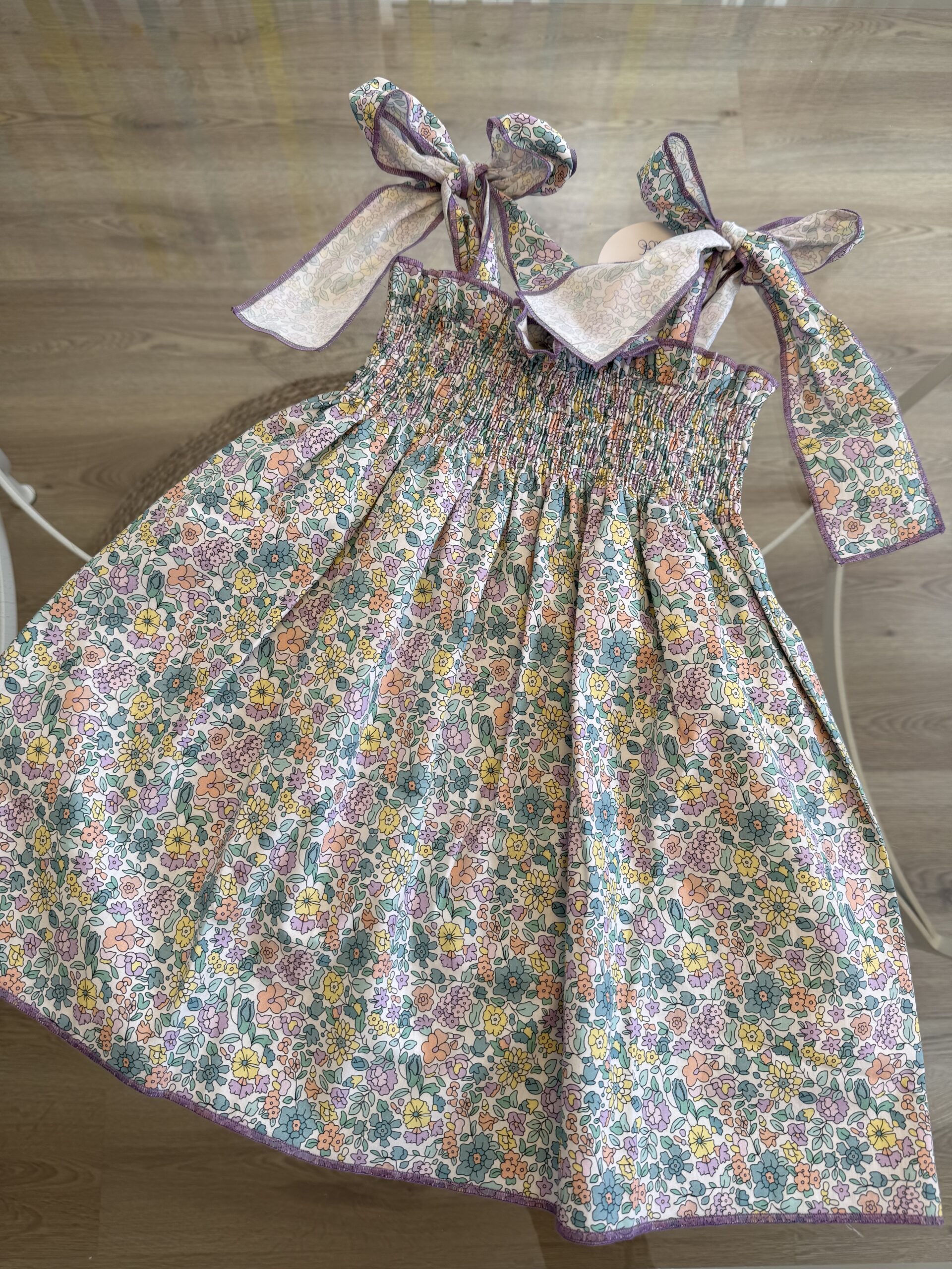 Vestido engomado en el pecho en tejido liberty morado anudado en los hombros