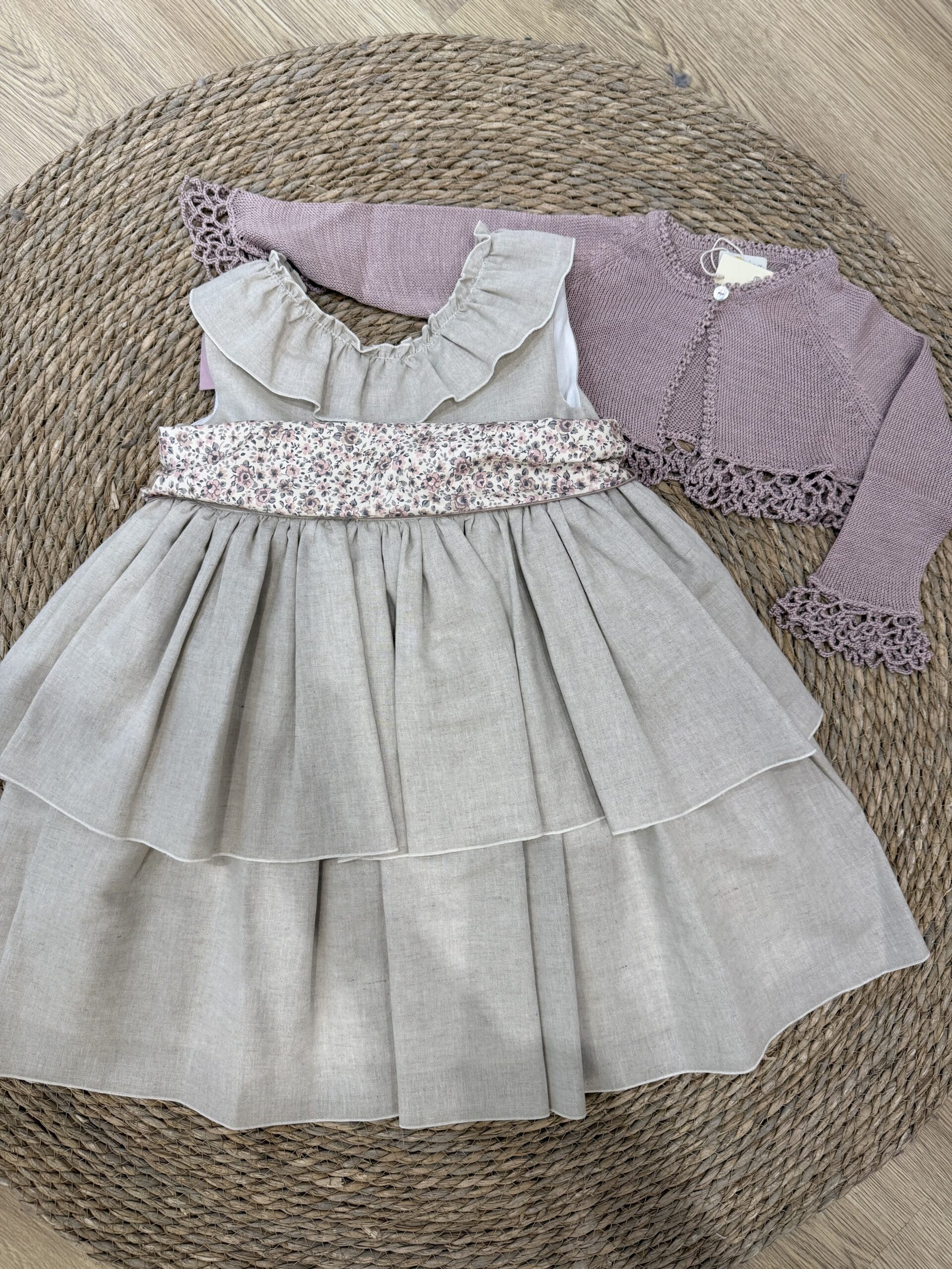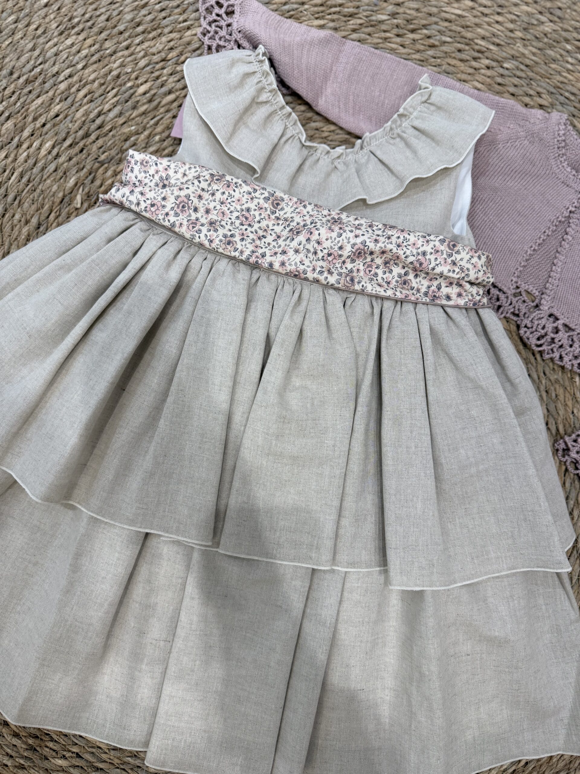 Vestido en tejido lino color lino de dos volantes y volante en el cuello con fajín de flores incluido