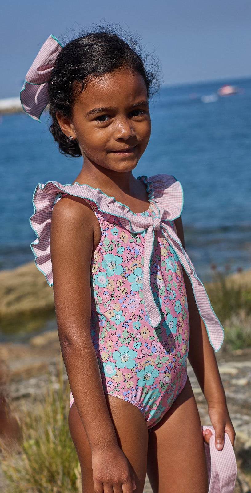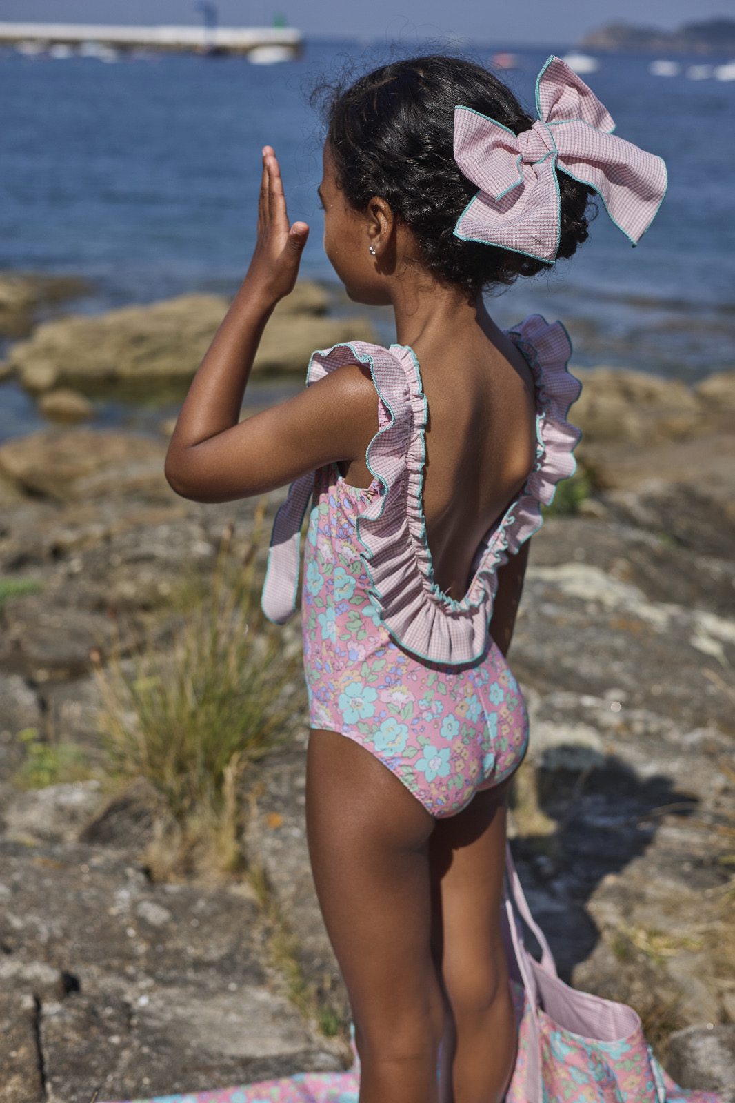 Bañador niña de flores todo ribeteado con picunela verde agua