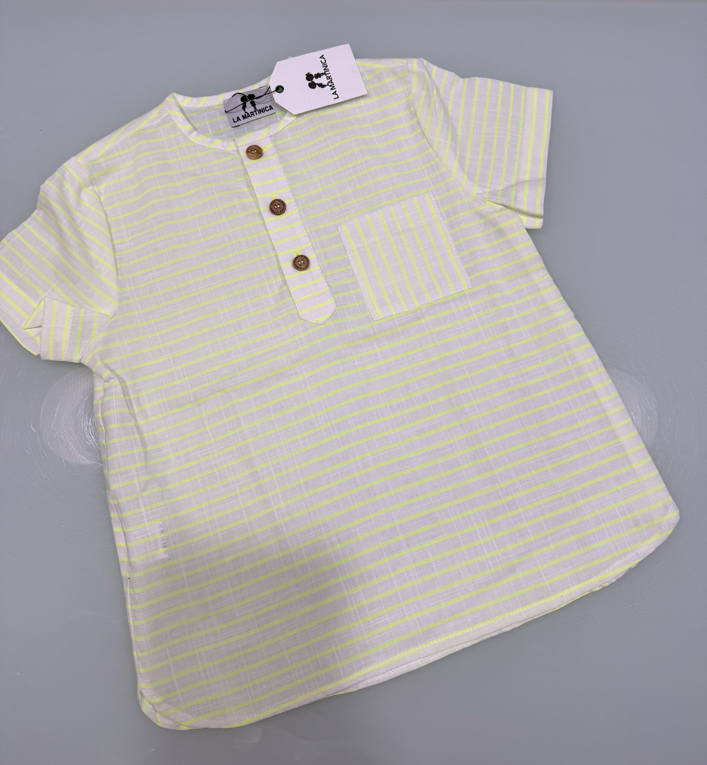 Camisa niño de manguita corta y cuello mao en tejido rayitas fluor
