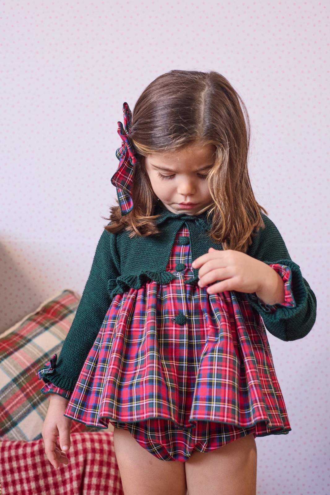 Chaqueta corta de punto en verde botella con lacitos tartán en los puños para combinar con jesusito