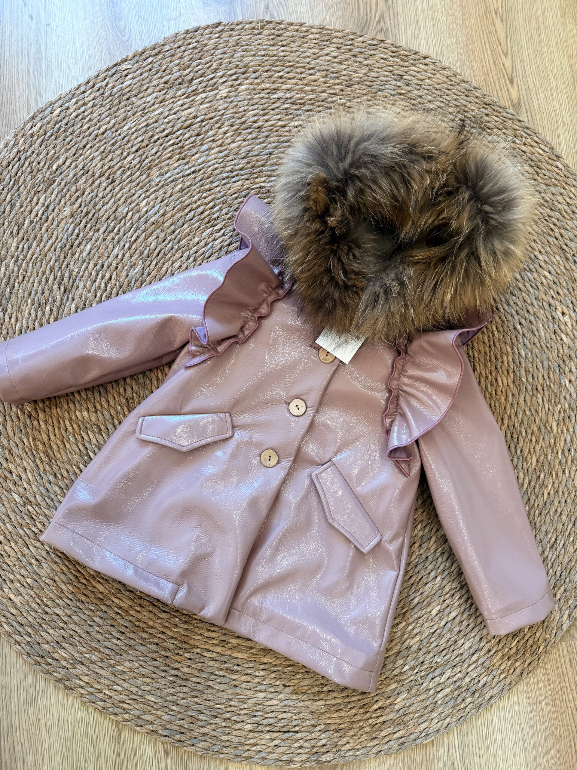 Charol en color rosa palo con volantes en el hombros , capucha con pelo natural que puedes quitar y poner y interior en pelito camel