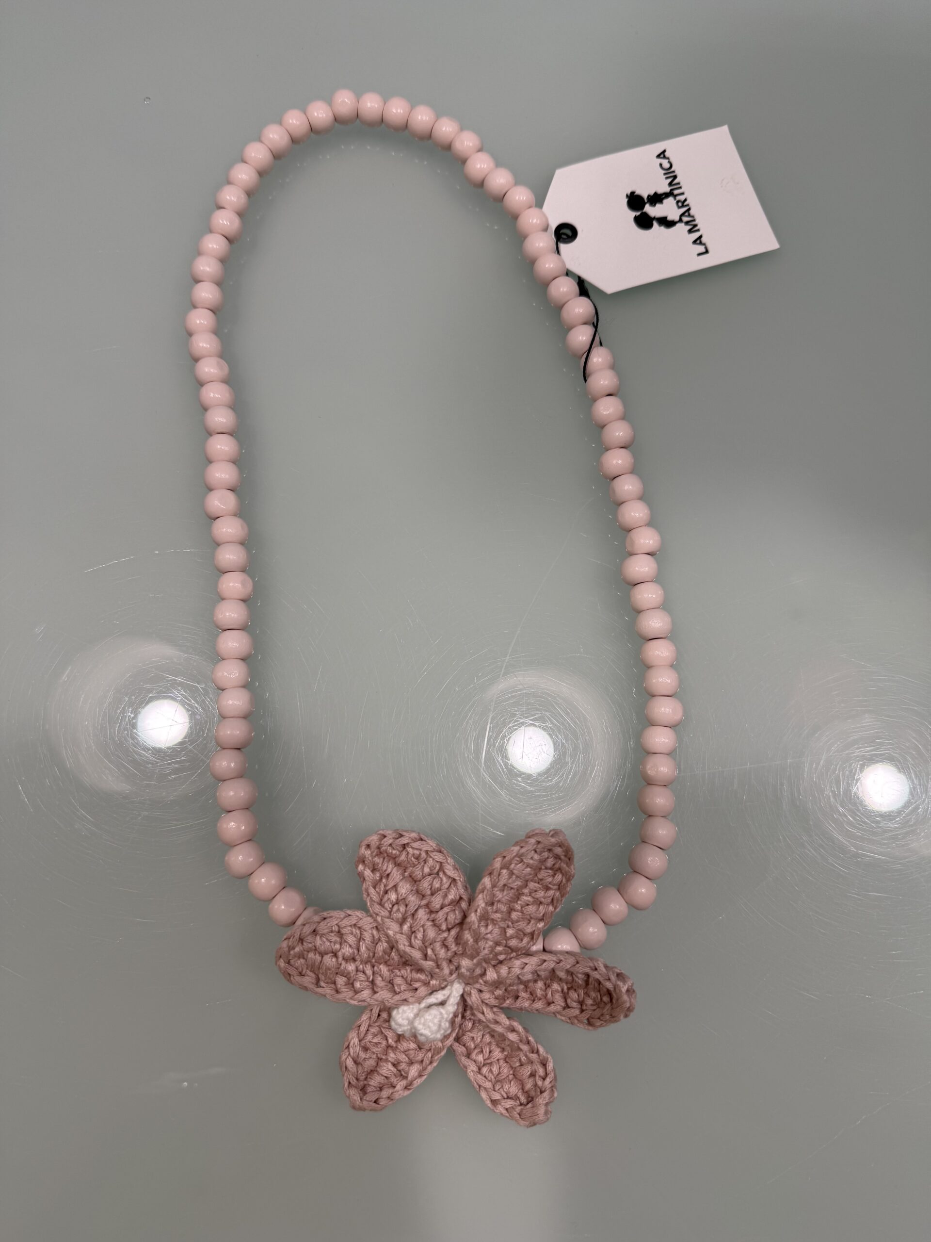 Collar en bolas rosa con flor ganchillo