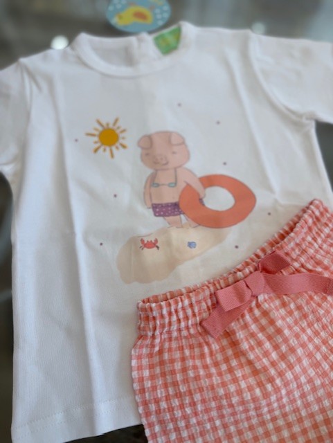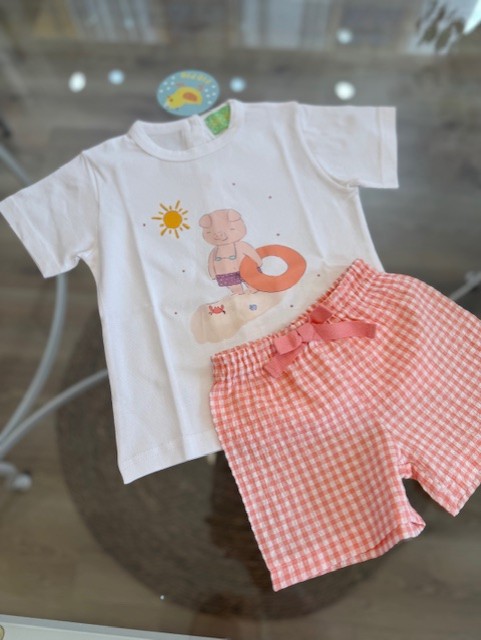 Conjunto de niño compuesto de camiseta algodón blanca con estampación cerdito en la playa más bermudita con goma en la cintura de tejido vichy melocotón muy fresquita