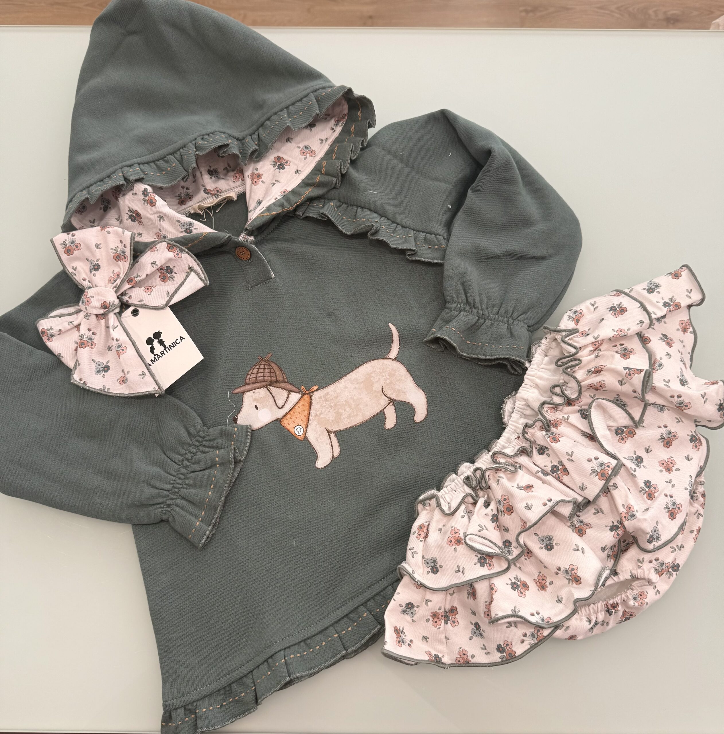 Conjunto de niña compuesto de sudadera en felpa verde con perrito más braga tela