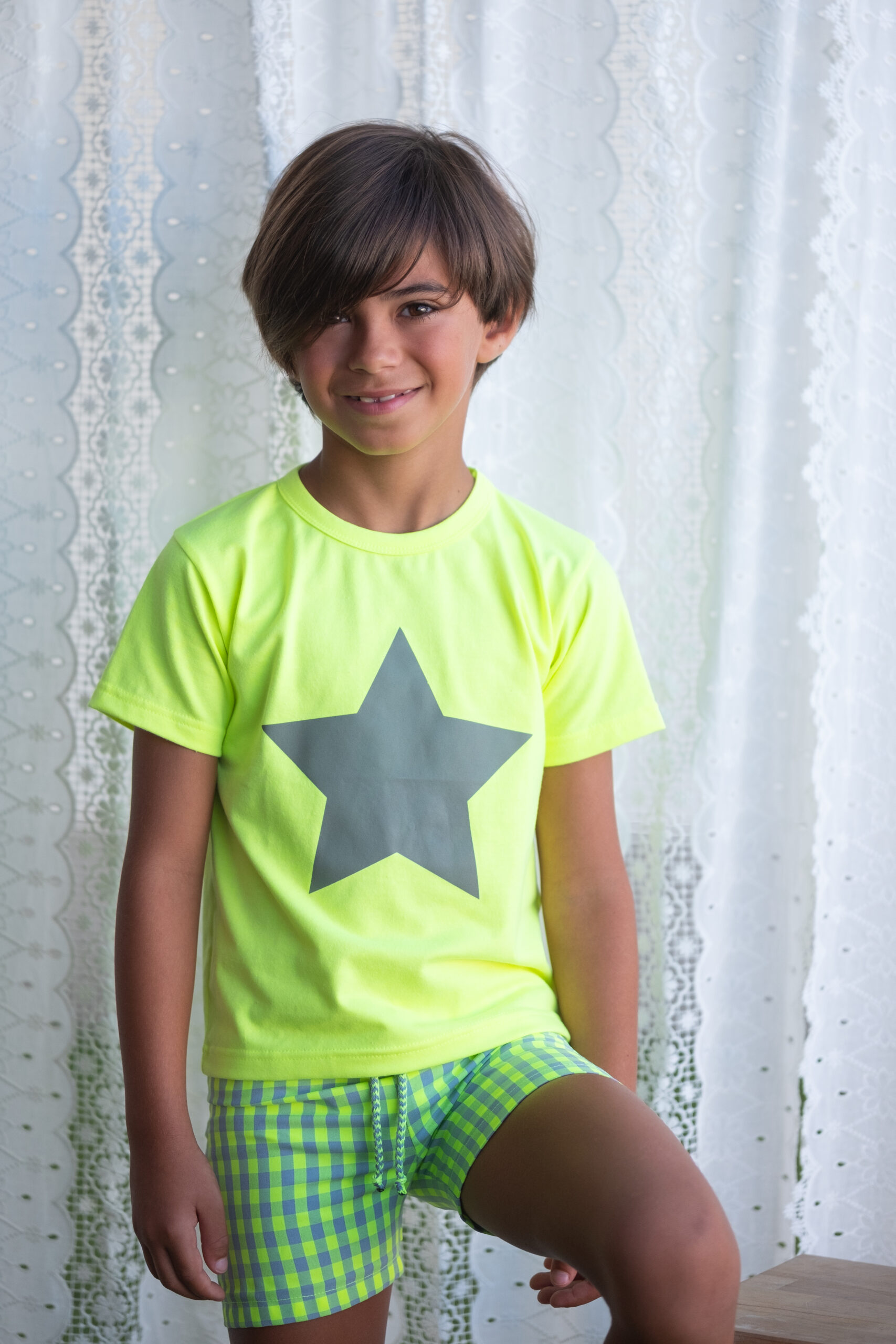 Conjunto de niño compuesto de camiseta fluor en amarillo con estampación estrella gris y bermuda vichy fluor con gris