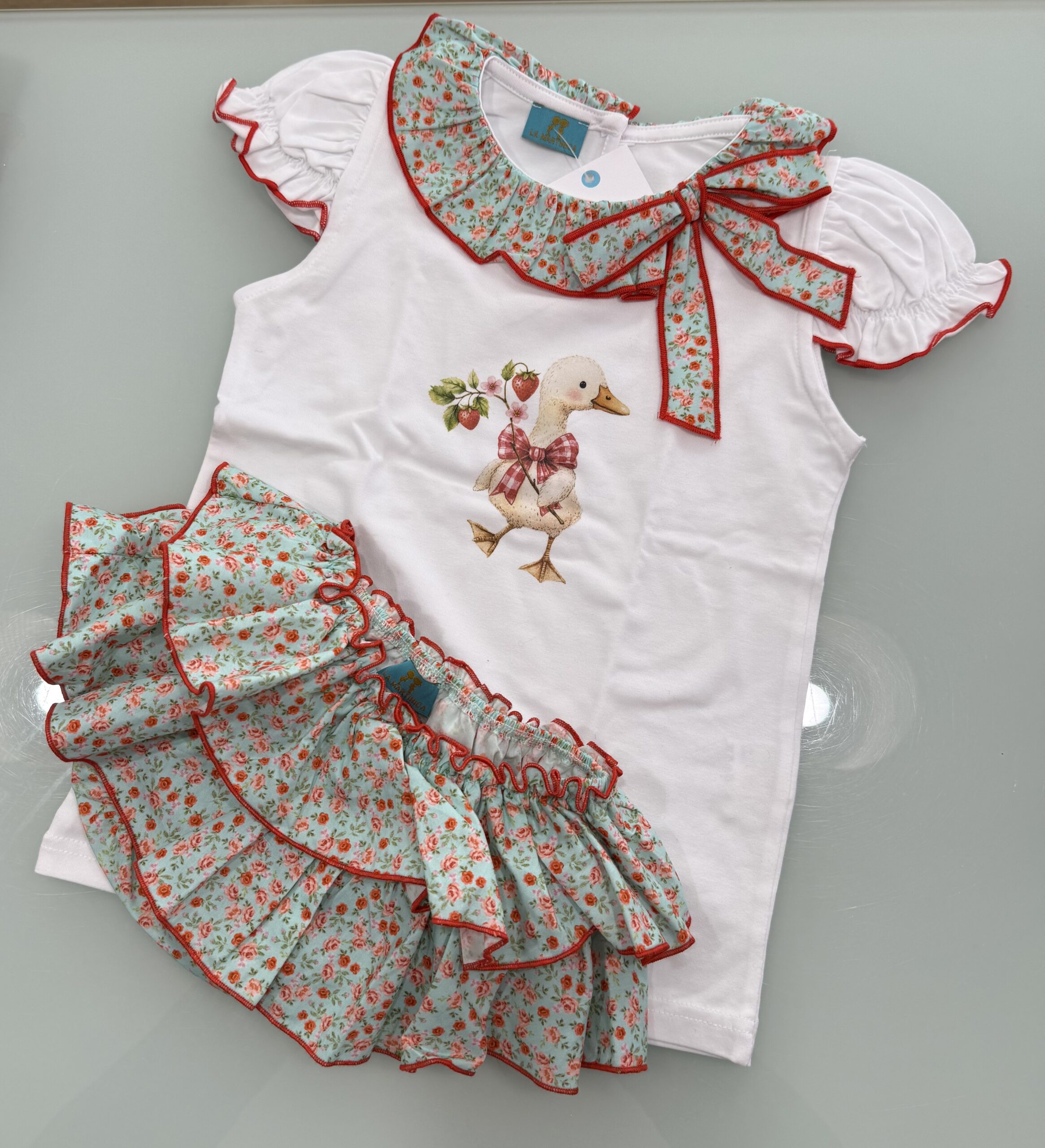 Conjunto de niña compuesto de camiseta algodón blanca más braguita volantes flores , estampación conejito en la camiseta y cuello volante en tejido de la braguita