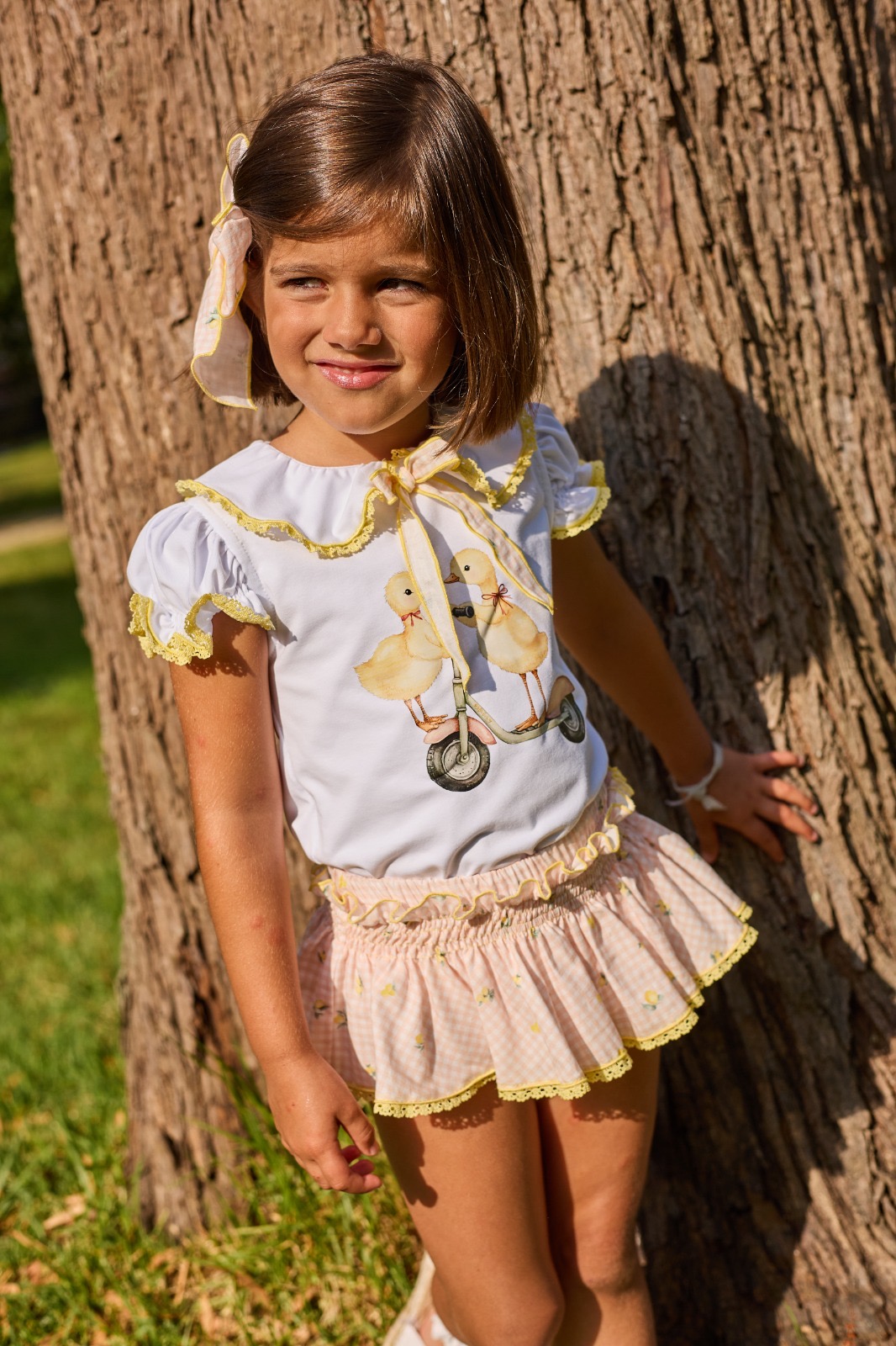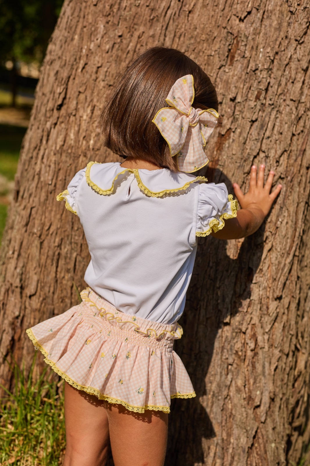 Conjunto de niña compuesto de camiseta algodón blanca de manguita corta con cuello volante todo rematado en puntillita amarilla más braguita de volante en tejido vichy rosa con limones
