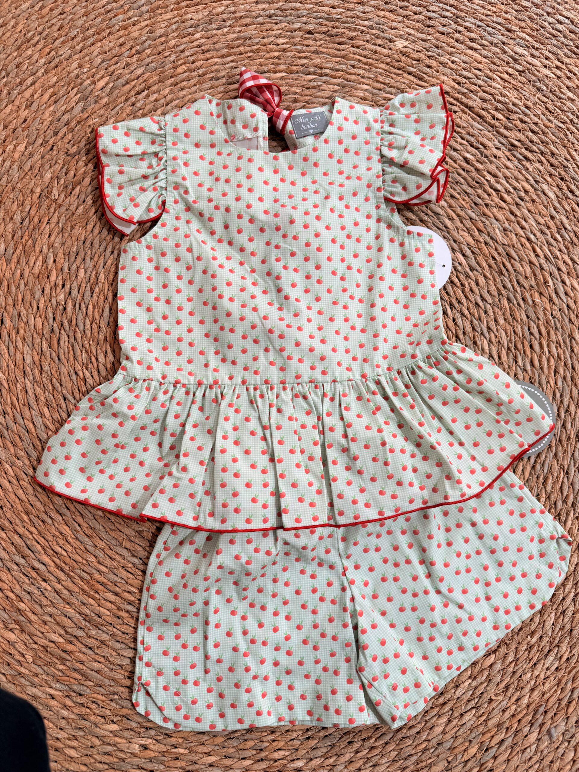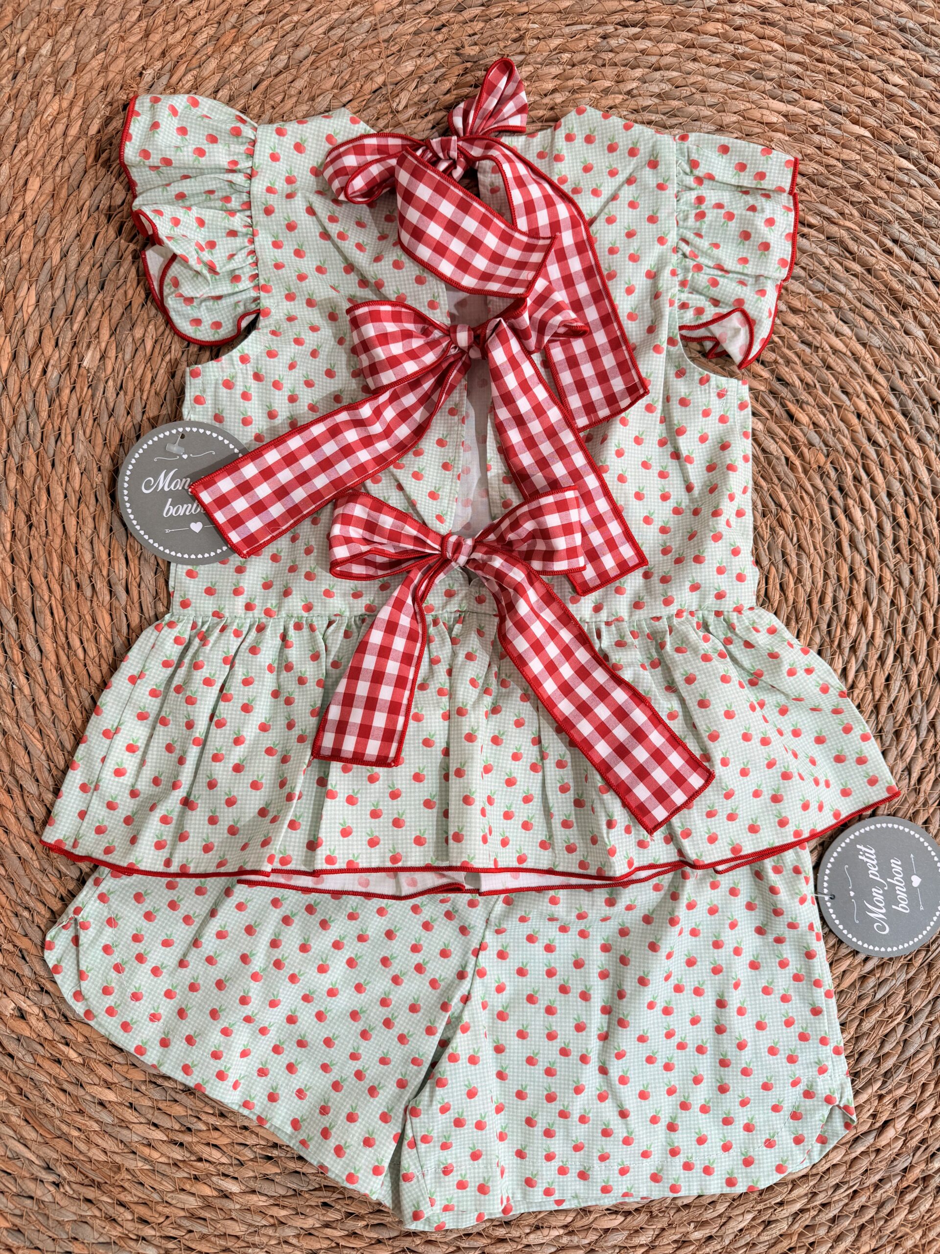 Conjunto de niña compuesto de blusita en tejido manzanas sin mangas acabado en volante en el bajo y anudado en la espalda con lazos vichy rojo más short en el mismo tejido manzanas con goma en la cintura