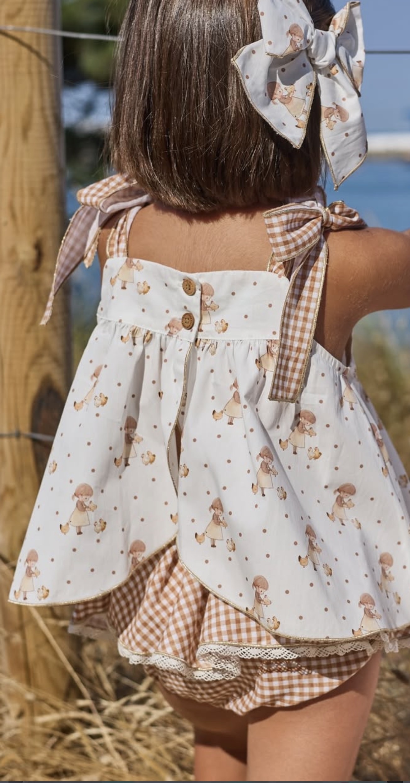 Conjunto de niña compuesto de blusita de tirantes anudados en los hombros en tejido vichy y camisa estampada de muñequitas más braguita vichy