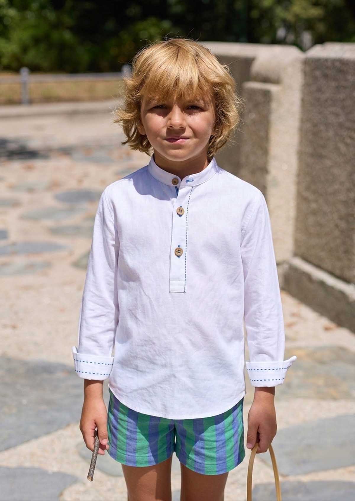 Conjunto de niño compuesto de camisa cuello mao y manga larga en color blanco con pantalón mini rayas