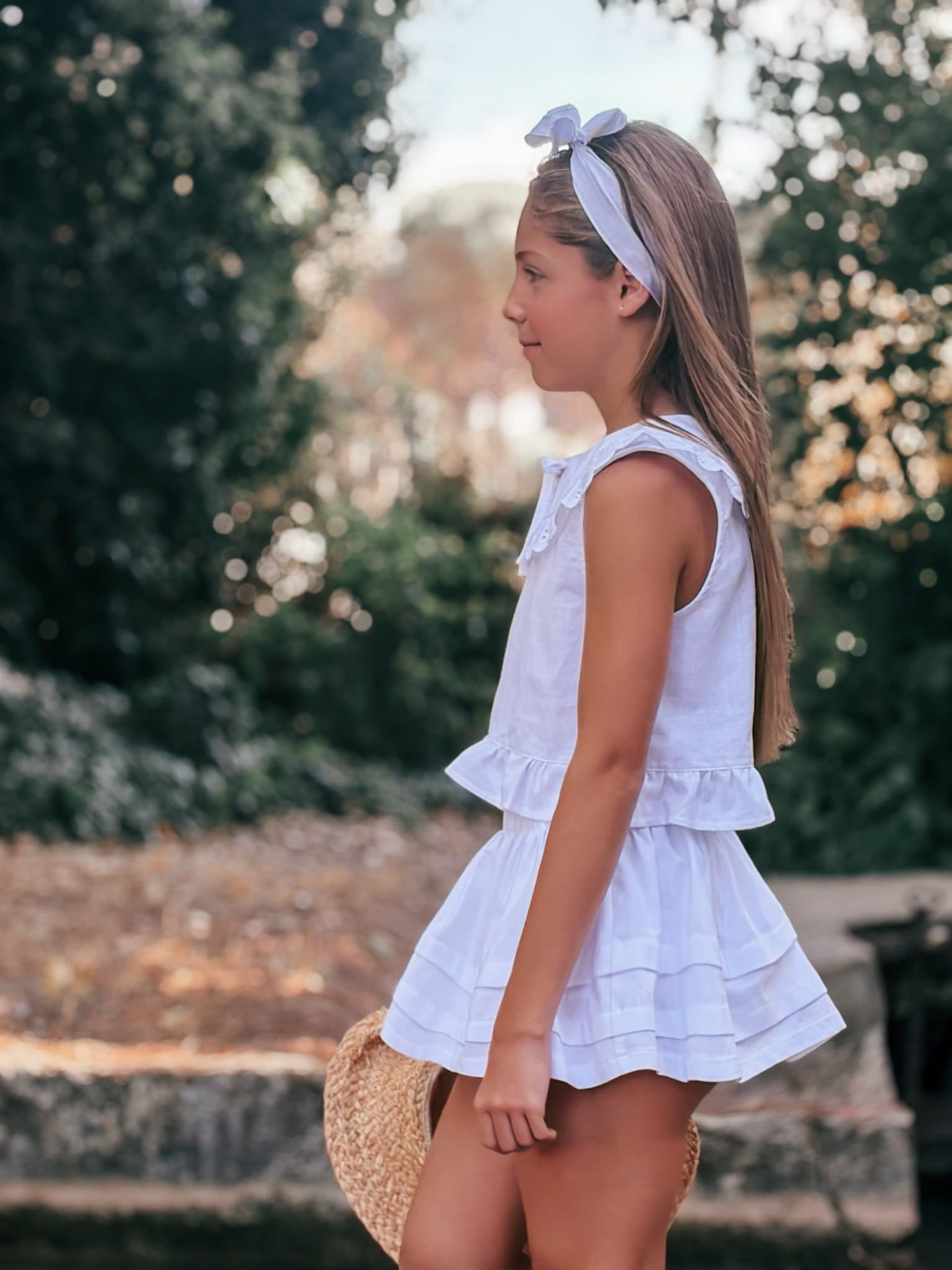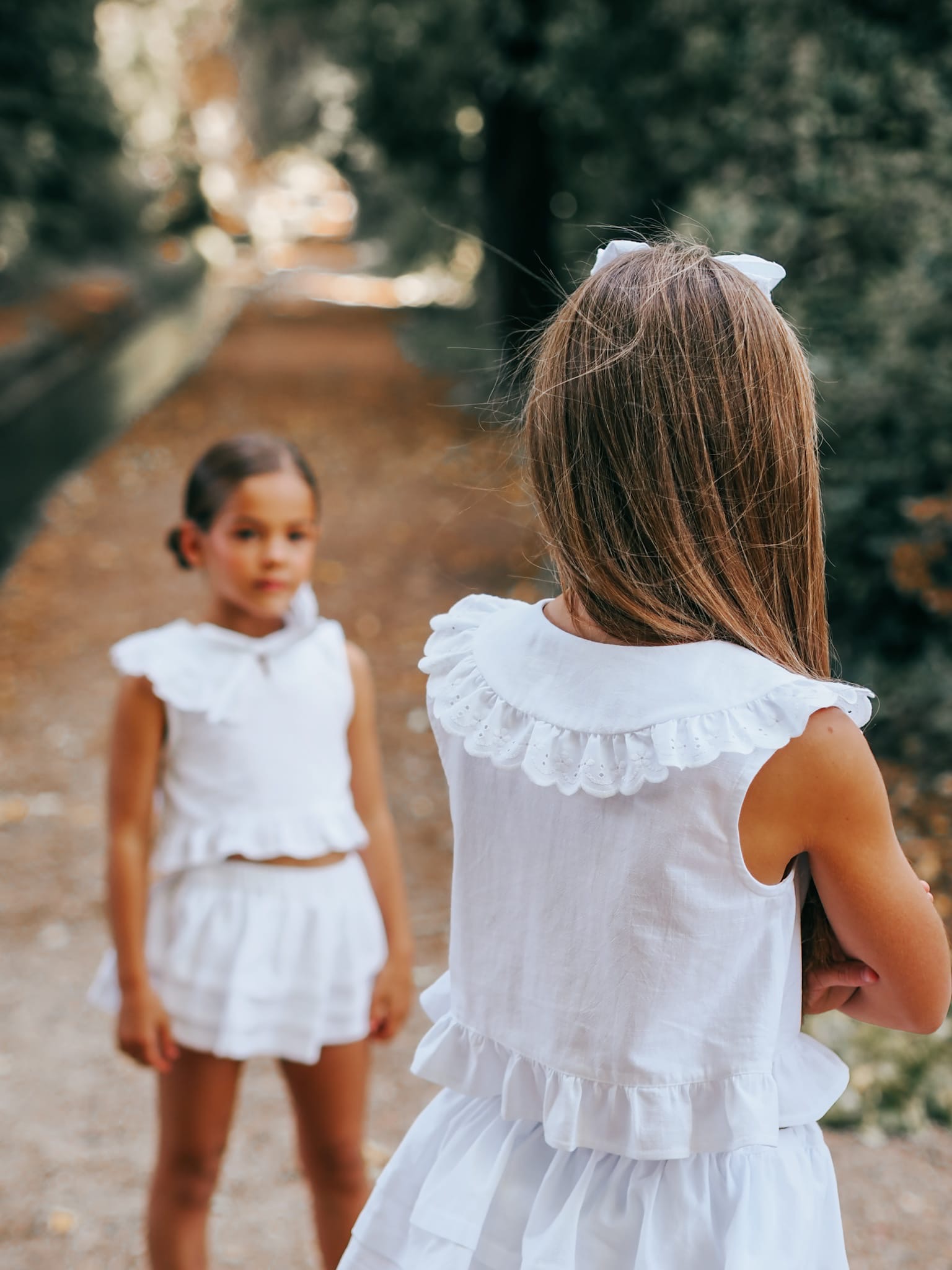 Conjunto de niña compuesto top sin mangas con cuello rematado con tira bordada , anudada en la parte delante, tejido de algodón rustico de aspecto similar al lino más Minifalda con doble jareta en la parte baja de la falda, lleva braga incluida en todas las tallas