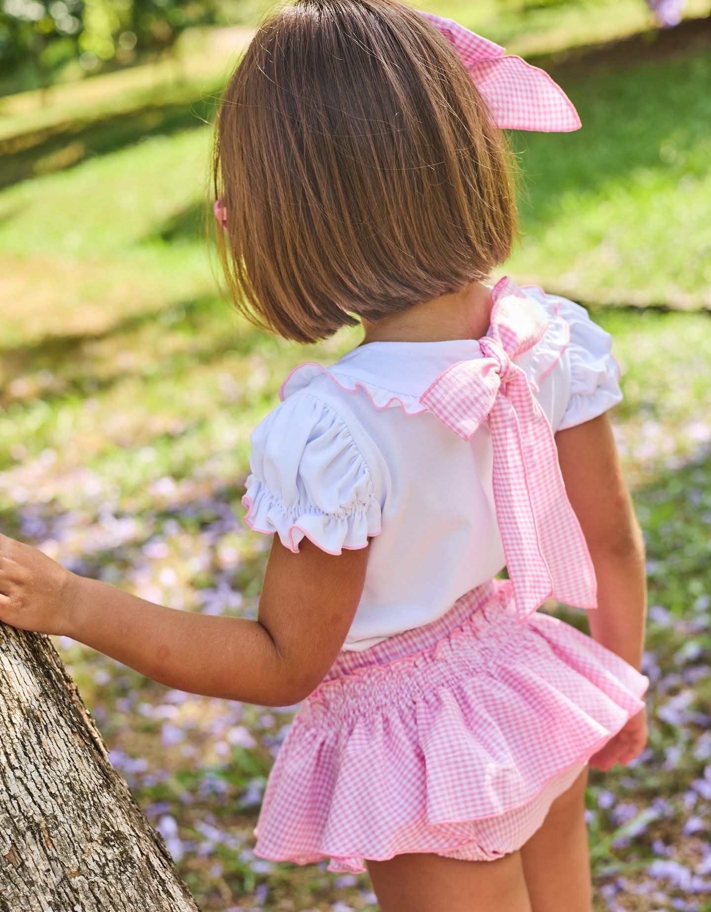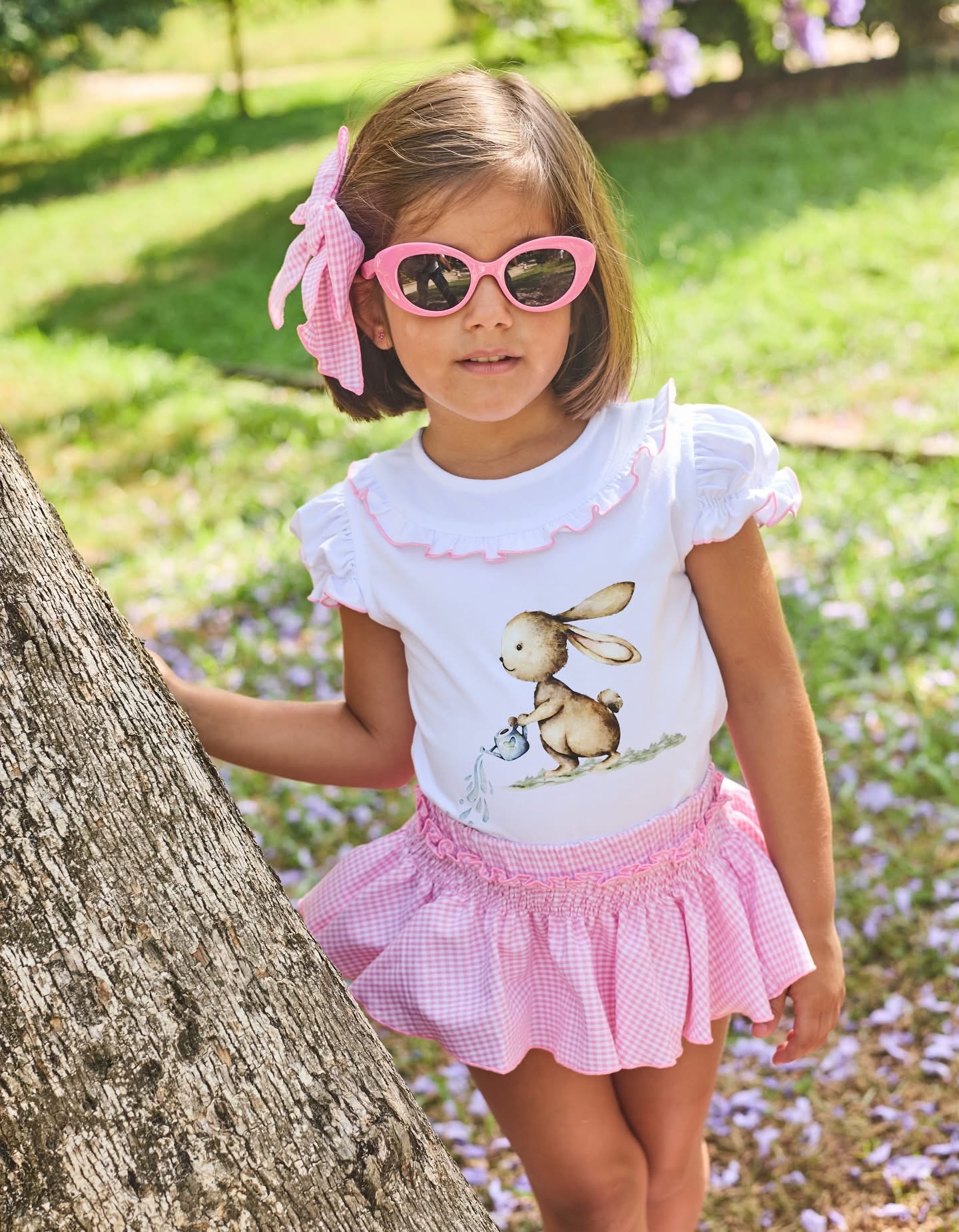 Conjunto de niña compuesto de camiseta algodón blanca más braguita volante en vichy rosa , estampación conejon y lazo en la espalda en vichy