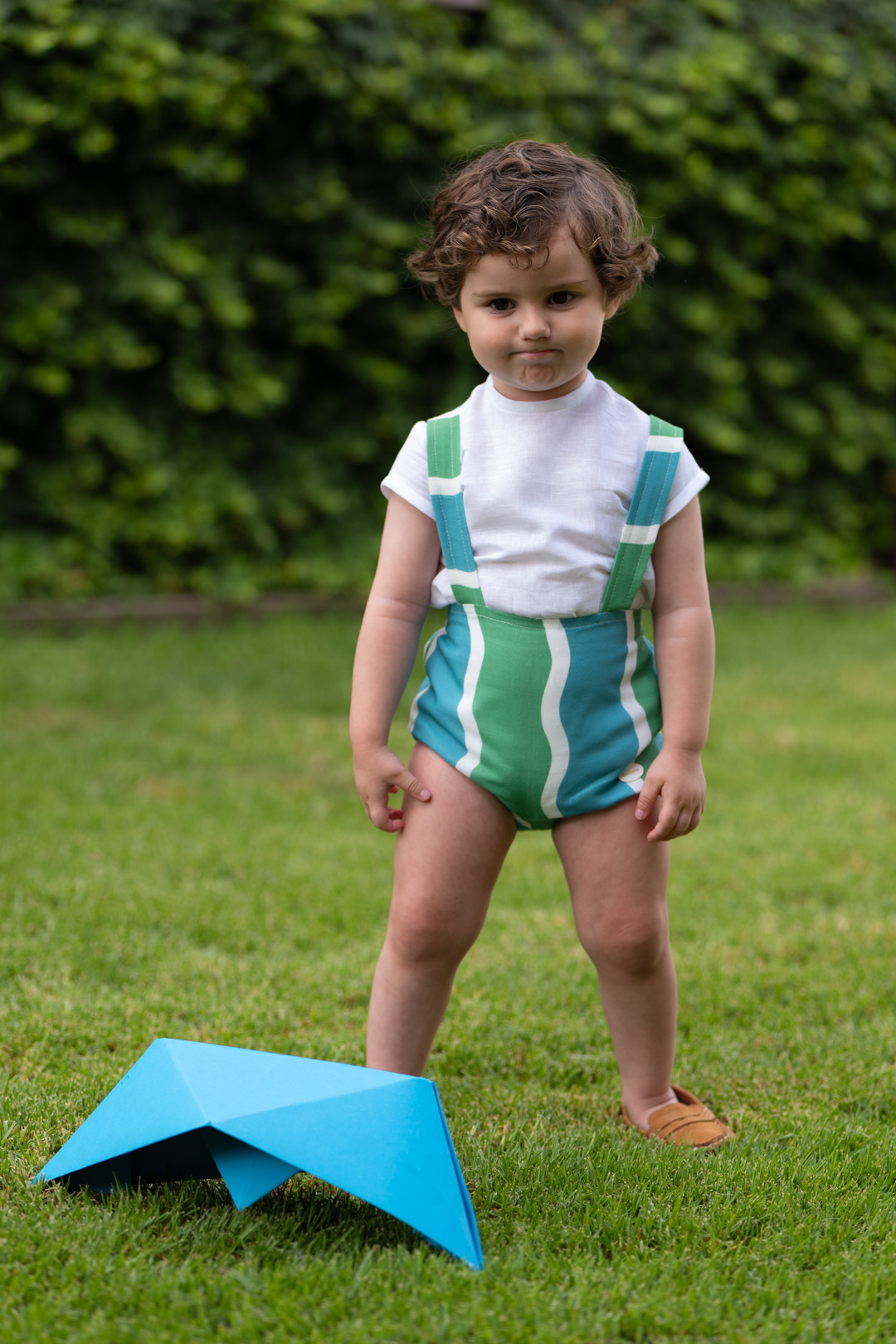 Conjunto de niño compuesto de ranita con tirantes en tejido ondas colores verde , turquesa y blanco con camisa manga corta blanca abotonada en la espalda