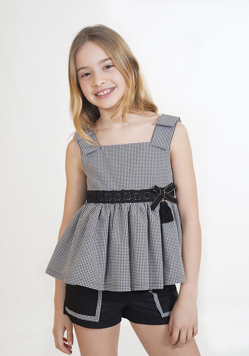 Conjunto de niña compuesto de blusa corte en el pecho con vuelo de tirantes en tejido vichy negro más short en tejido negro con goma interior para ajustar