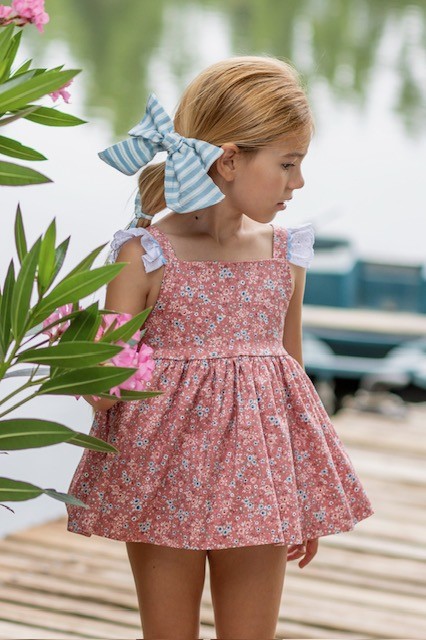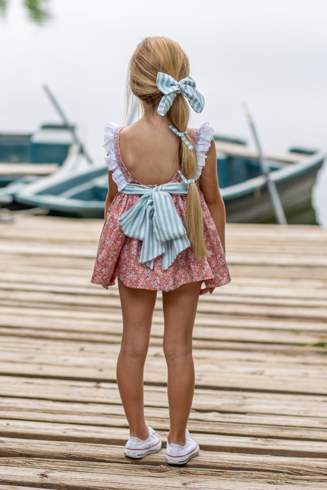 Jesusito más braguita en tejido flores combinado con raya turquesa anudado en la espalda acabado en lazada