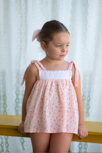 Jesusito más braguita en tejido bambula de flores en tirantes anudados en los hombros y puntilla entredos en el pecho