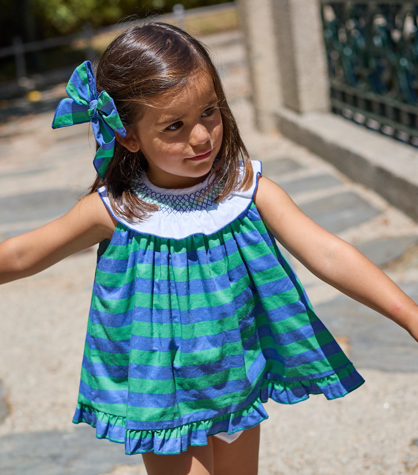Jesusito más braguita con cuello nido de abeja y tejido rayado verde y azul y acabado en la espalda en redondito donde se ve ligeramente la braguita