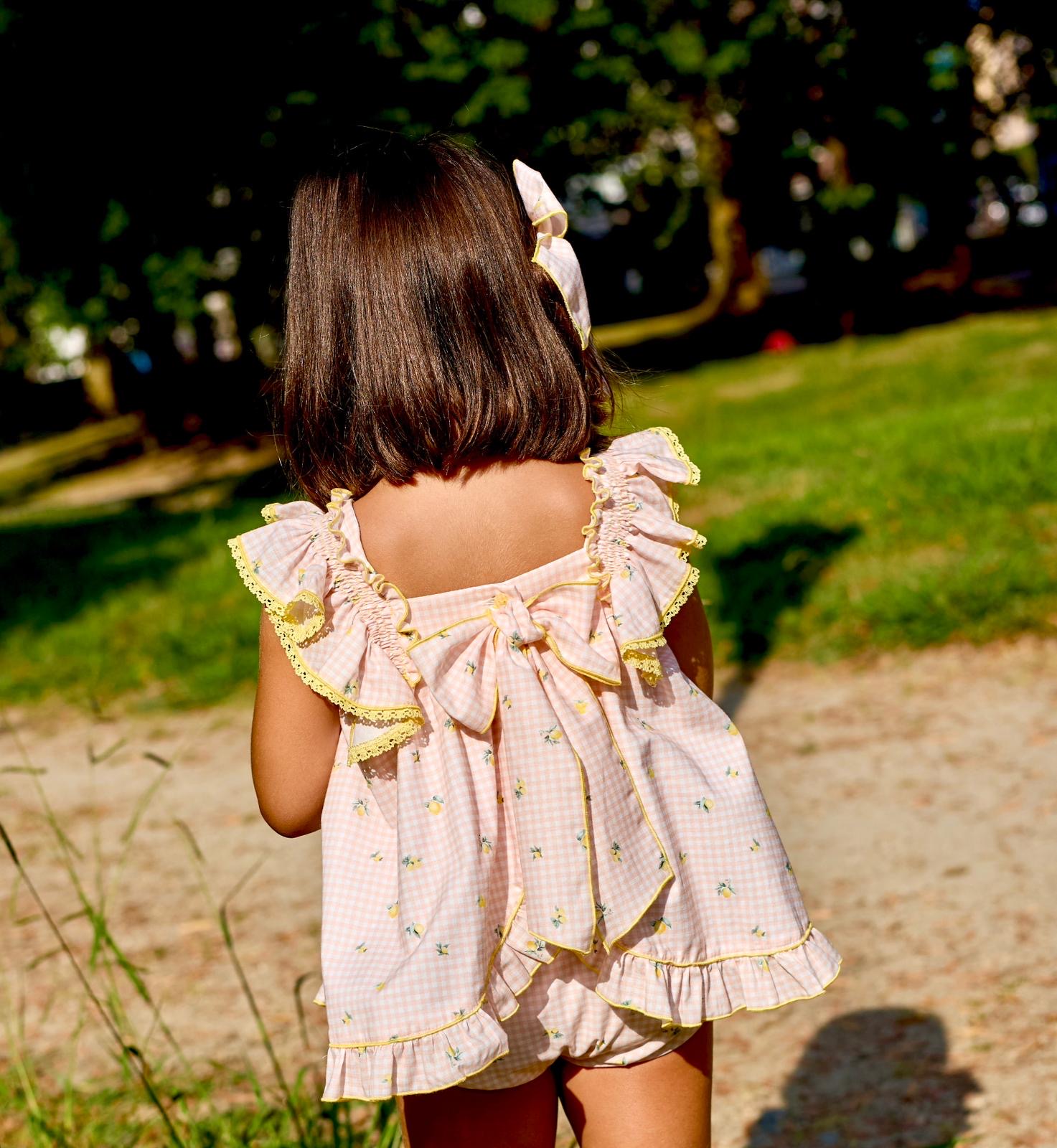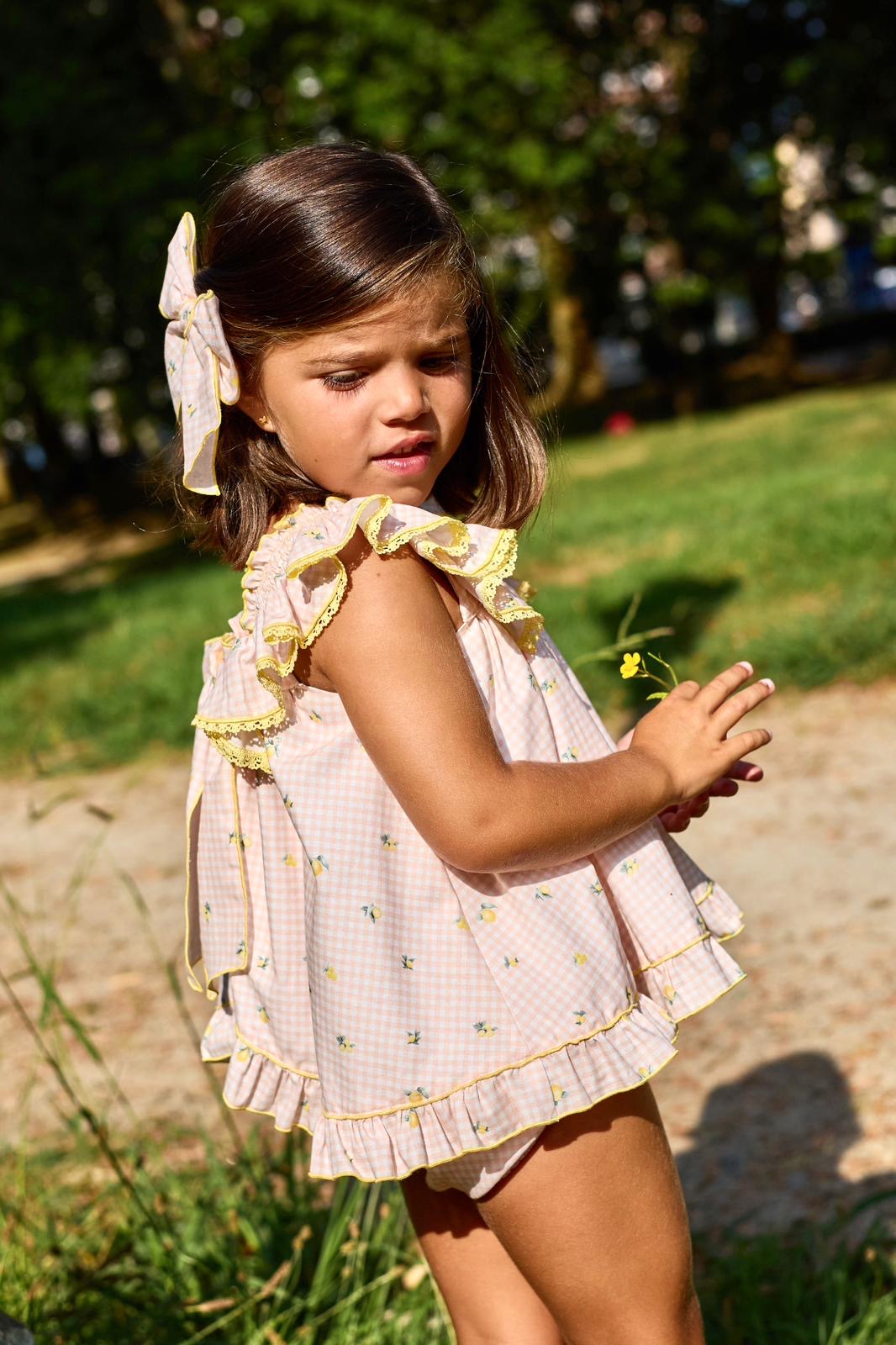 Jesusito más braguita en tejido vichy con limones con corte amplio de tirantes abotonado en la espalda con gran lazada