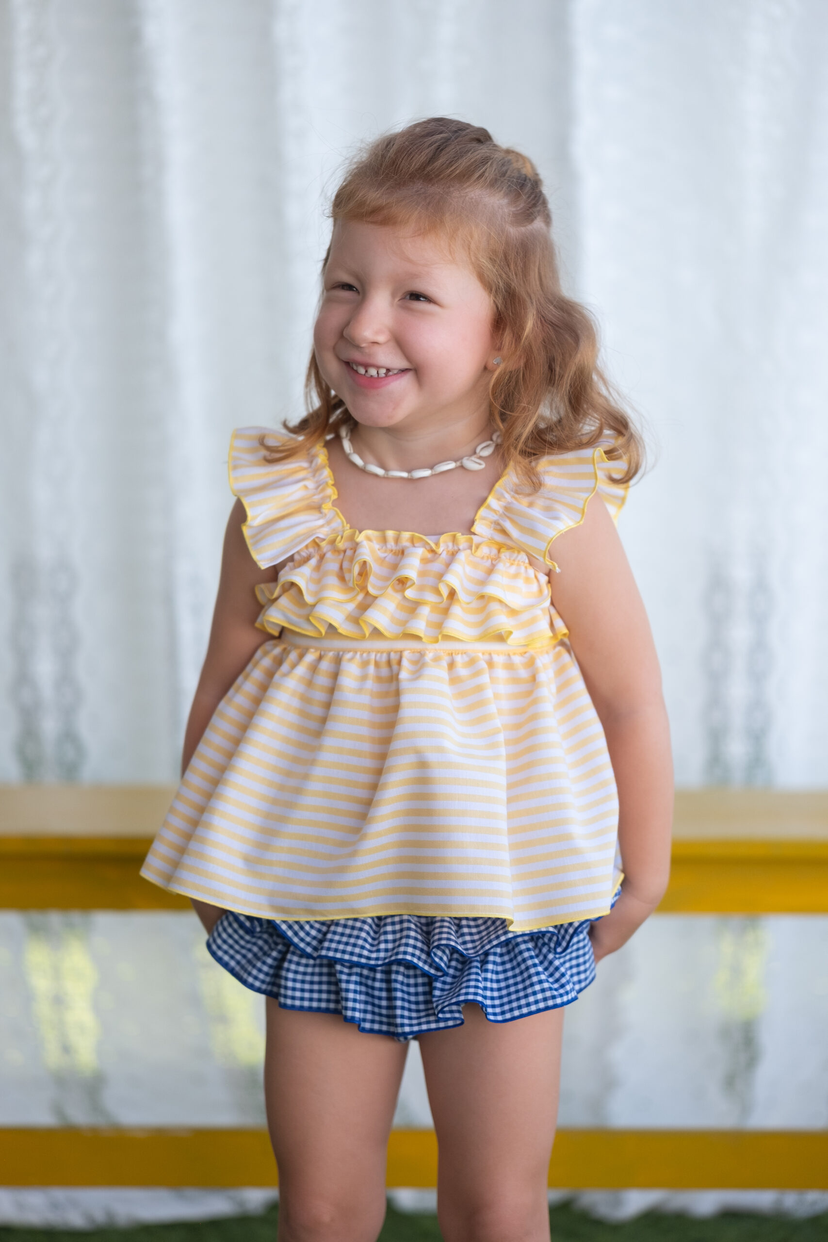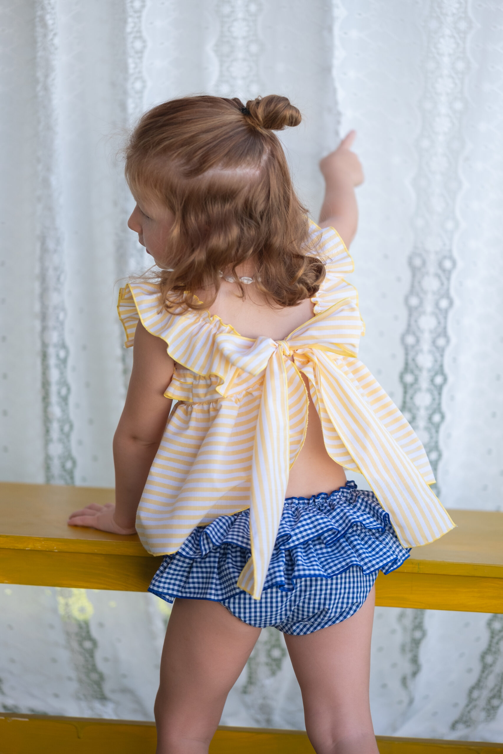 Jesusito con corte en el pecho de tirantes y anudado en la espalda con el mismo tejido de rayas amarillas más braguita al contraste en vichy azulón