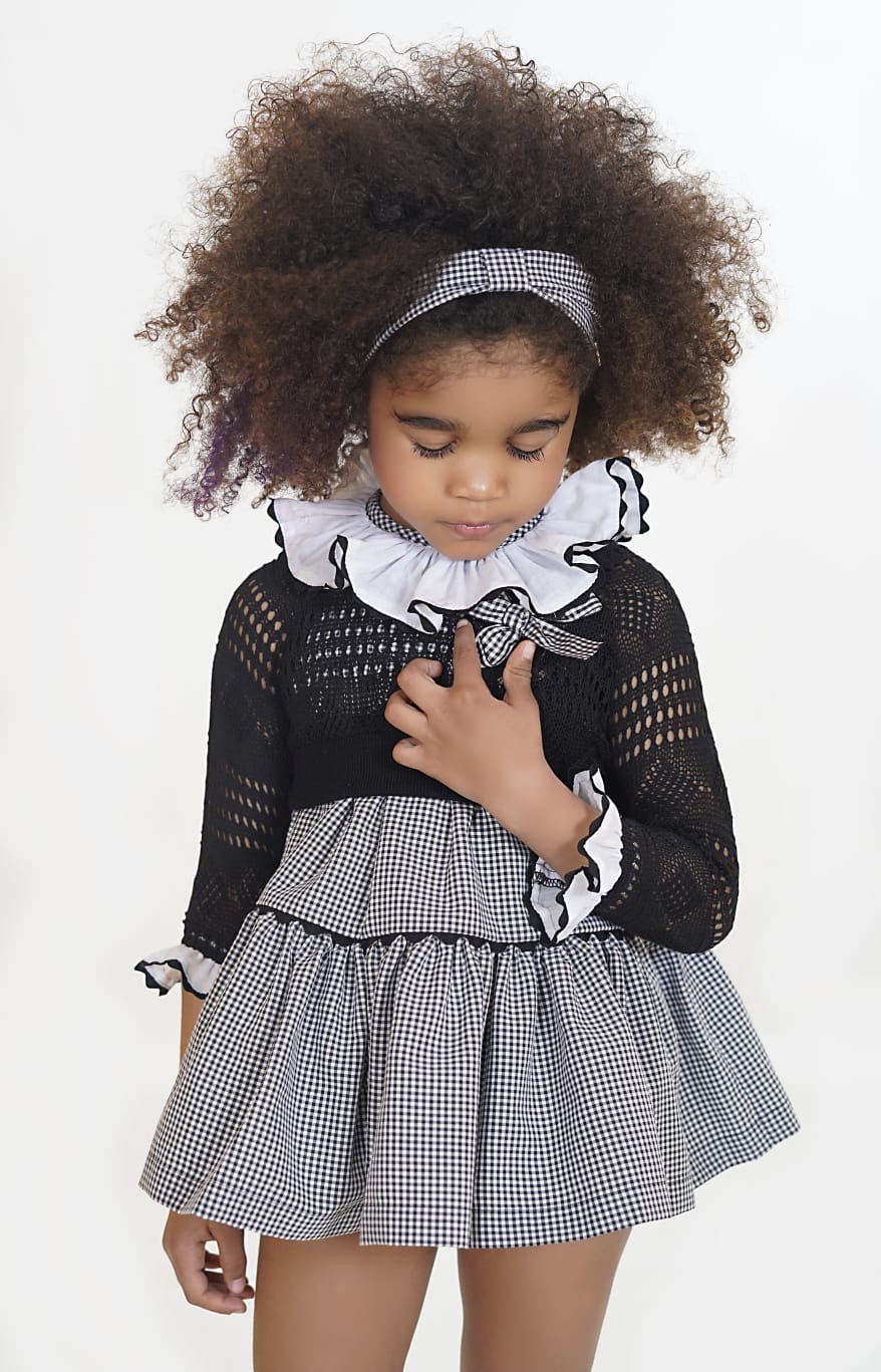 Jesusito más braguita en tejido vichy negro con cuelo volante en tejido blanco con vuelo desde el pecho en varios cortes
