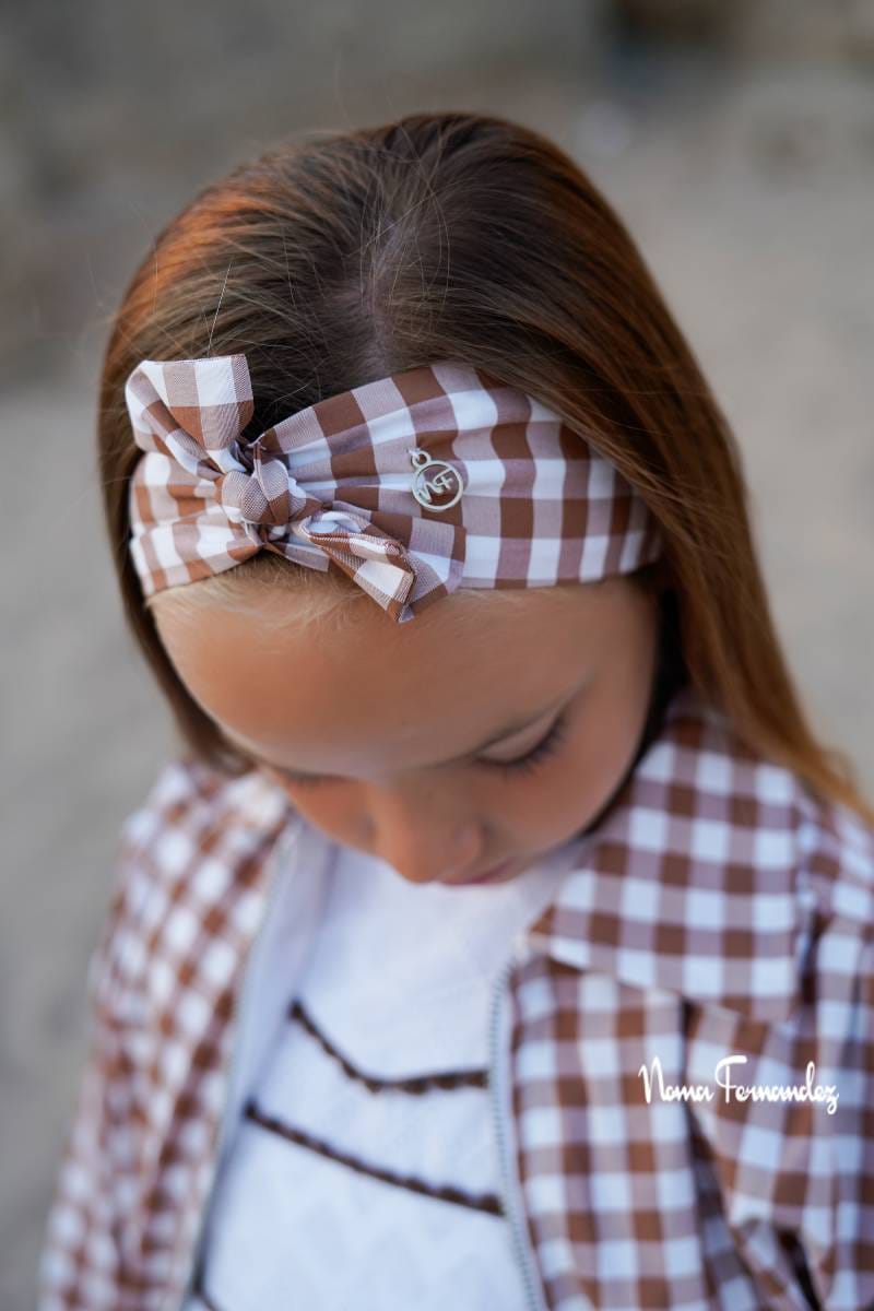 Turbante nudo en tejido vichy marrón para completar el conjunto con los mejores detalles