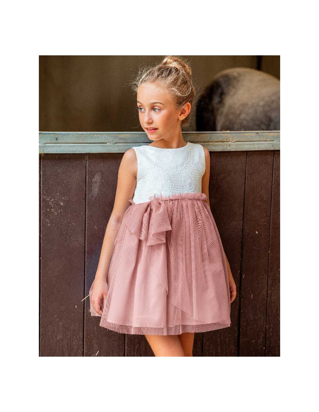 Vestido de niña con corte en la cintura y falda en tul rosa y cuerpo en tejido blanco perforado con obertura en la espalda