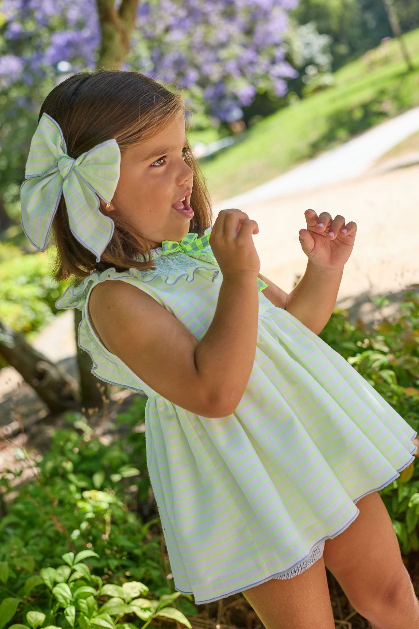Vestido niña en tejido rayas con corte en la cintura y vuelo en el bajo con cuello volante en nido de abeja