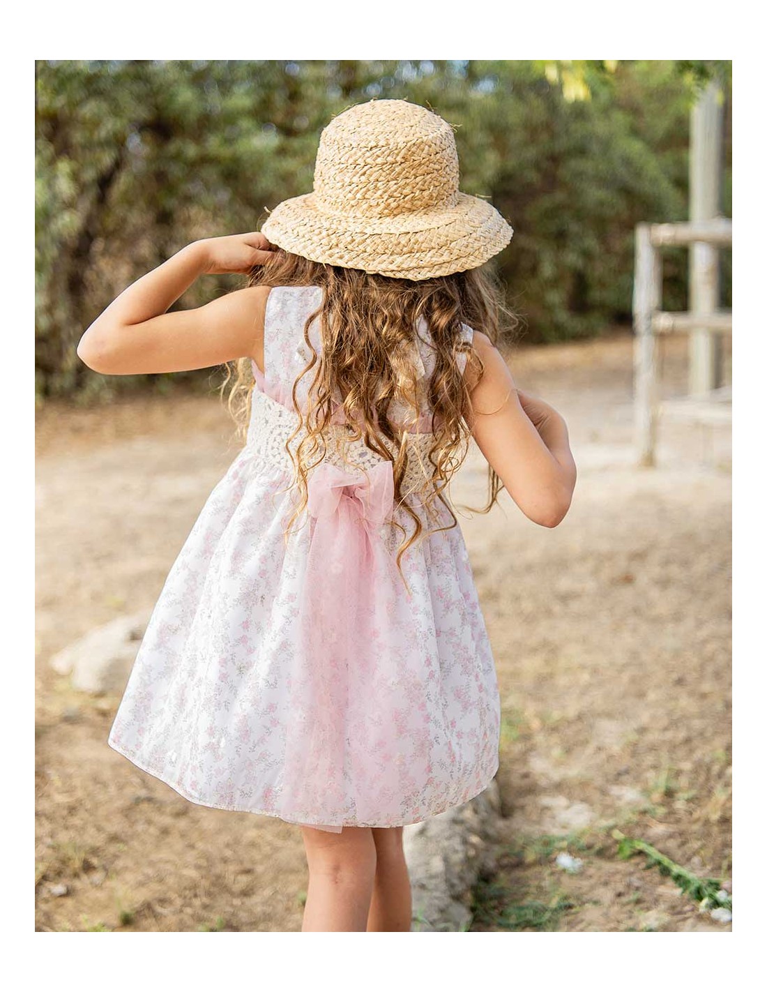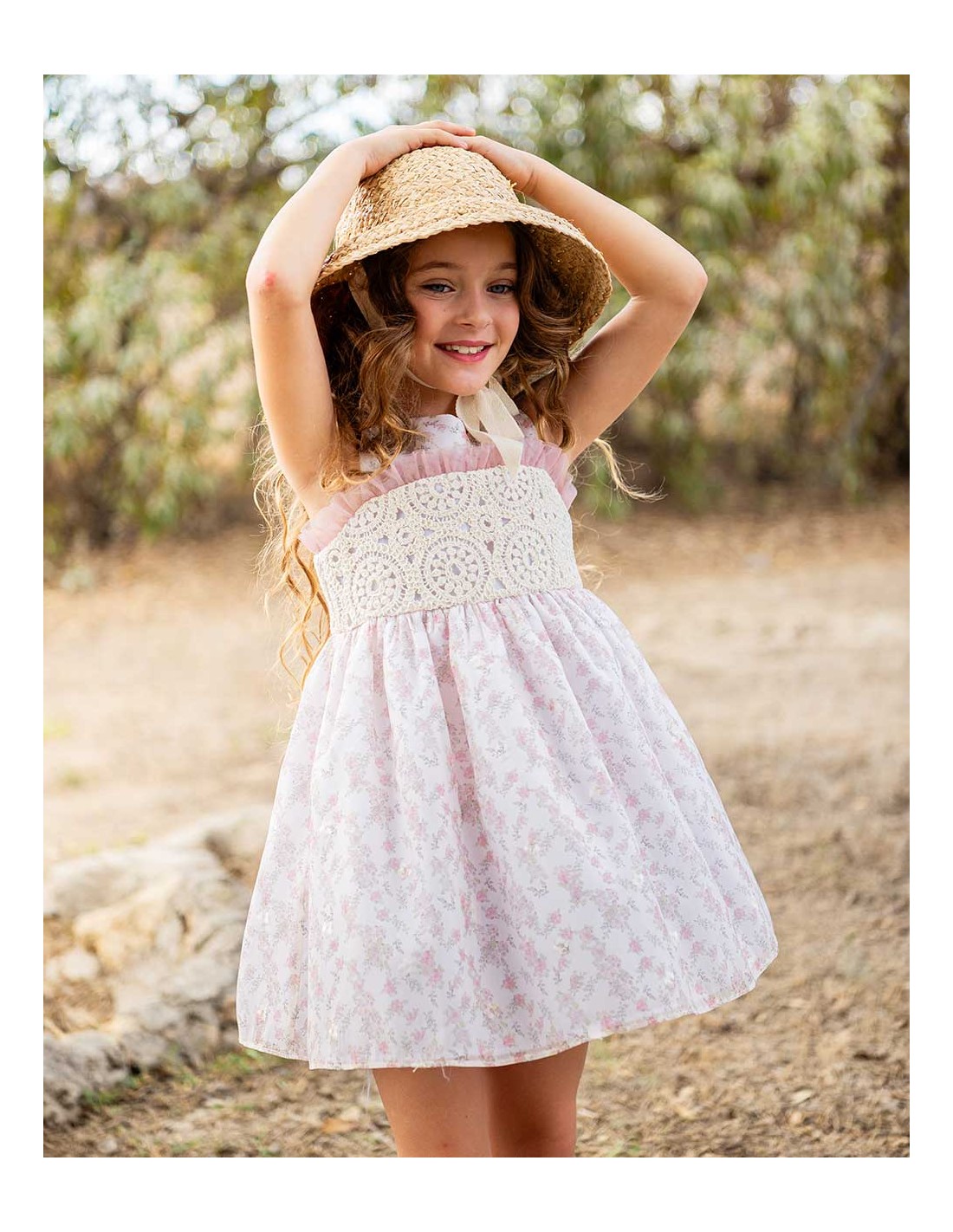 Vestido niña en tejido flores con corte en la cintura con ganchillo y tul rosa envolviendo todo el pecho y espalda un poco abierta