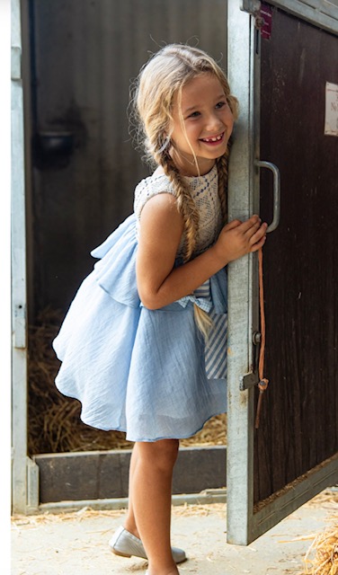 Vestido con corte en la cintura , cuerpo ganchillo , falda en tejido celeste con varias capas haciendo volantes y lazada con tejido rayas al tono