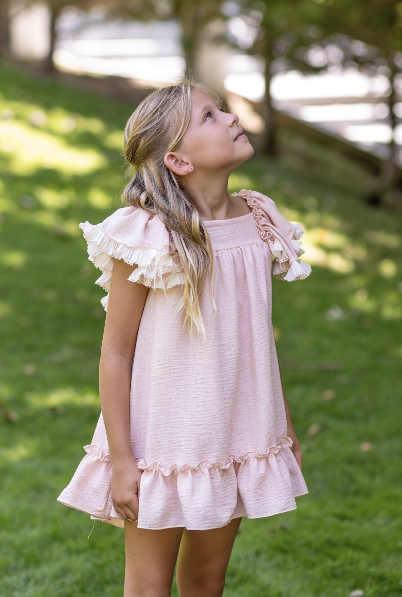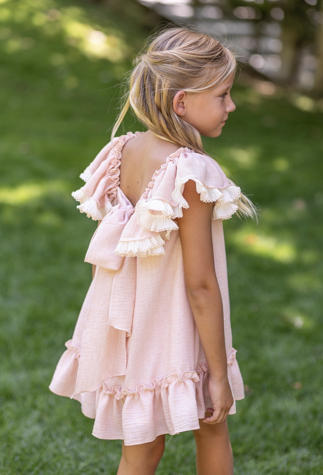 Vestido de niña evasé en tejido bambula de tirantes en los hombros con tejido haciendo volante caido y escote cuadrado con gran lazada en la espalda